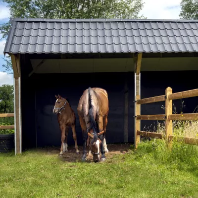 Nuestros refugios fueron diseñados tomando en cuenta el mejor bienestar para los animales. Las dimensiones ofrecen un espacio adecuado para que uno o dos caballos se acuesten adentro, dependiendo del modelo que elija.